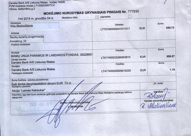 Šie pinigėliai jau pervesti paramos ir labdaros fondui MAMŲ UNIJA ir, tikimės, padės ne tik Domui ir Laurynui išvykti gydytis, bet ir visiems mažiesiems ligoniukams sveikti.