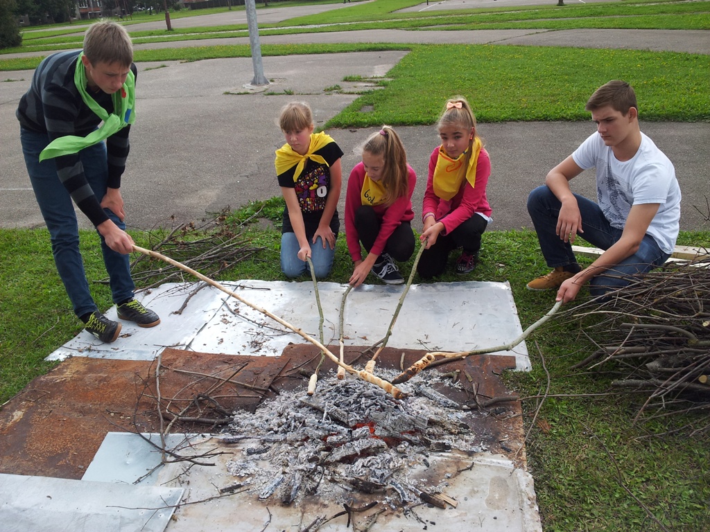 Antradienį mus aplankė skautai, kurie atvyko kupini įvairiausių, įdomiausių sumanymų. Stovyklautojai žygiavo, žaidė, dainavo, bendravo, mokėsi vieni iš kitų. O kur dar laužo kūrenimas ir skautų duonos kepimas!