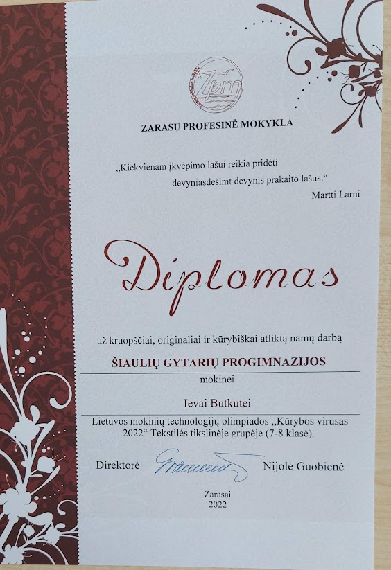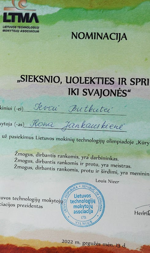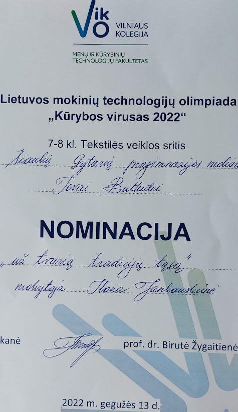 Gegužės 13 dieną Zarasų profesinėje mokykloje vyko mokinių Respublikinė technologijų olimpiada. Joje dalyvavo Šiauliuose pirmą vietą užėmusi 8b klasės mokinė Ieva Butkutė ir mokytoja Ilona Jankauskienė. Jos olimpiadai pristatė kūrybinį darbą ,,Tvarumas. Iš seno į naują“. Už kruopščiai, originaliai ir kūrybiškai atliktą darbą vertinimo komisija skyrė tris nominacijas. Po olimpiados buvo surengta meninė programa, mokytojai dalyvavo ekskursijoje po Zarasų kraštą, aplankė dviejų tūkstančių metų senumo Stelmužės ąžuolą.