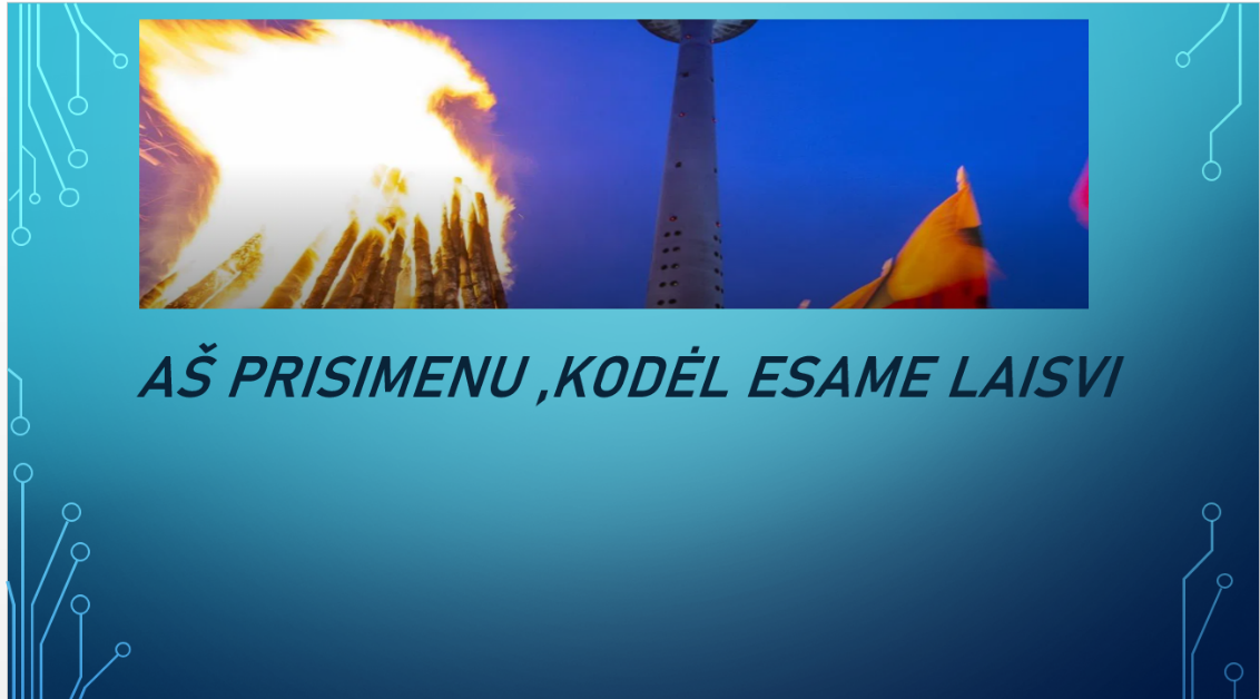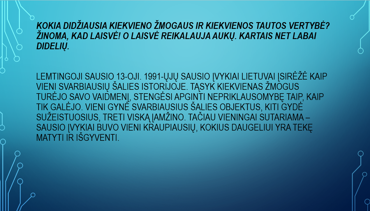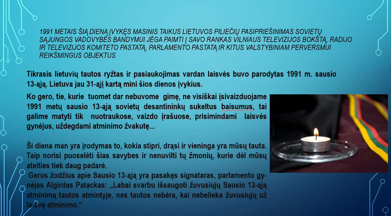 Kokia didžiausia kiekvieno žmogaus ir tautos vertybė? Žinoma - Laisvė , o Laisvė reikalauja aukų, kartais net labai didelių. Šiandien sausio 13–toji. Praėjo 31 metai nuo 1991m. Tada taip pat buvo šalta... Ko gero, tie, kurie tuomet dar nebuvome gimę, ne visiškai įsivaizduojame 1991 metų sausio 13-ąją sovietų desantininkų sukeltus baisumus, tai galime matyti tik nuotraukose, vaizdo įrašuose, prisimindami laisvės gynėjus, uždegdami atminimo žvakutę...Minėdami Sausio 13-ąją vieningai su visomis Lietuvos mokyklomis įsijungėme į pilietinę akciją „Atmintis gyva, nes liudija", paminėjome Sausio 13-osios tragediją. Šį rytą skambant tyliai muzikai languose buvo uždegtos žvakutės, prisiminti Laisvės gynėjai, sudėję pačią brangiausią savo gyvenimo auką už mūsų visų laisvę.