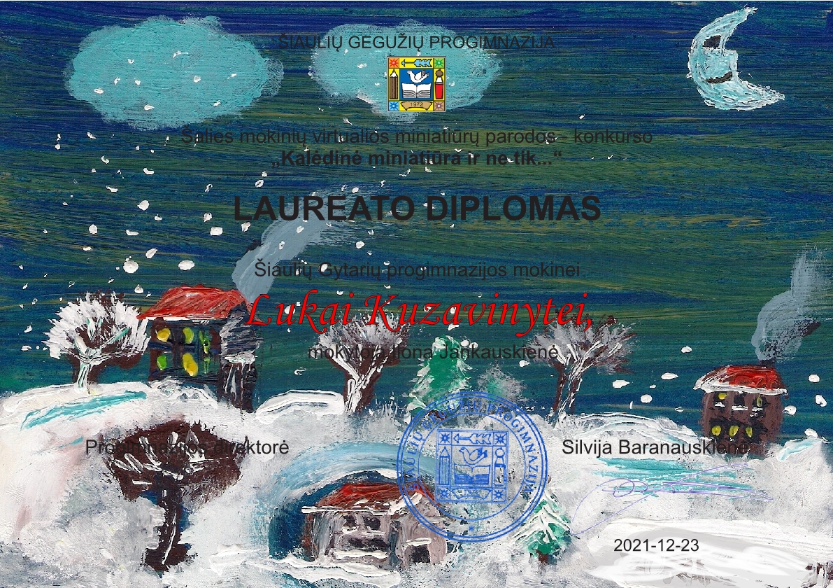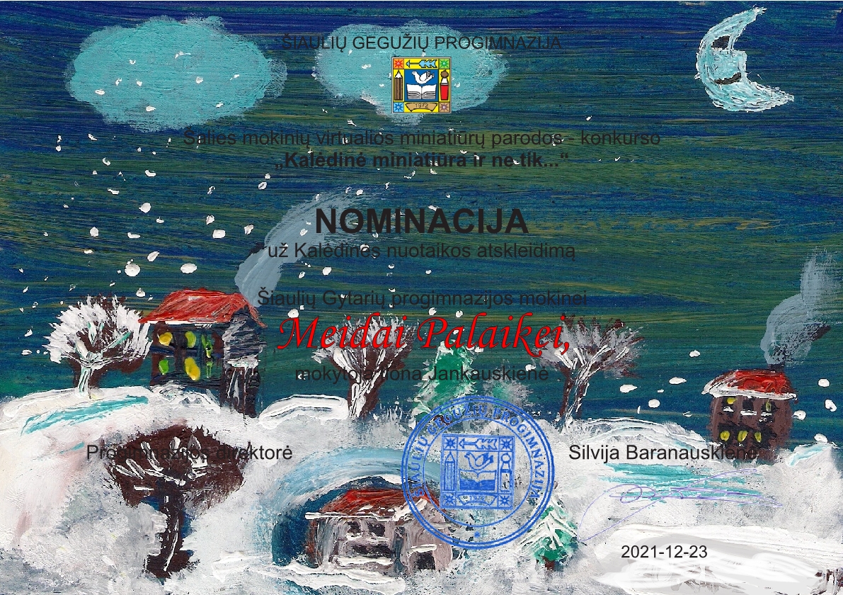 „Kalėdų šventėje daug šilumos, grožio, džiaugsmo, dovanų, dėmesio vienas kitam. Tad ir mažytė popieriaus skiautelė šiuo laikotarpiu turi galią tapti pačia prasmingiausia žinute – paslaptimi, kurią visada smagu stebėti ir ieškoti joje sau artimos minties"- rašo šios parodos organizatoriai.Parodoje-konkurse dalyvavo 379 mokiniai iš 64 Lietuvos ugdymo įstaigų. Mūsų mokyklos mokiniai, vadovaujami dailės mokytojos Ilonos Jankauskienės, šiam konkursui pateikė dvidešimt darbų. Sulaukėme džiugios žinios. Trys piešinėliai pateko tarp geriausiųjų. Sveikiname nominantes Simoną Žvigaitytę (6c kl.), Meidą Palaikę (5a kl.) ir konkurso laureatę Luką Kuzavinytę (7a kl.).