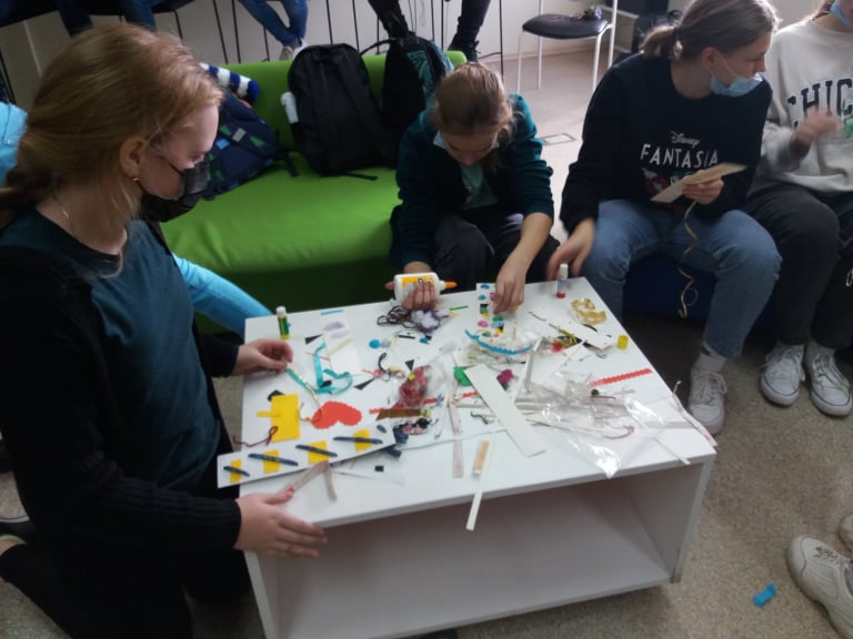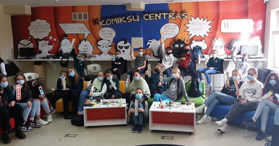 Spalio 5 d. į Šiaulių miesto savivaldybės viešosios bibliotekos „Saulės" filialą (K. Korsako g. 10) sugužėjo Šiaulių Gytarių 7a klasės mokiniai su mokytoja Ilona Jankauskiene. Jaunieji kūrėjai buvo pakviesti dalyvauti kūrybinėje edukacijoje „Sukurkime tvarų skirtuką", organizuotoje įgyvendinant Lietuvos kultūros tarybos ir Šiaulių miesto savivaldybės dalinai finansuotą projektą „EKOBIBLIOTEKA: rytojaus kūrėjai 2".Edukacijos pradžioje projekto vadovė Jurgita Januševičiūtė-Taralė vaikams papasakojo apie projektą, jo idėją, atskleidė, kaip svarbu rūpinti gamta, stengiantis kuo mažiau sukurti šiukšlių, t. y. „vietoj to, kad mes pirktume naują skirtuką, jį galime pasidaryti, pavyzdžiui, iš namuose esančių įvairių daiktų: nuo dovanų likusios juostelės, nereikalingo kartono lapo," – pasakojo vaikams J. Januševičiūtė-Taralė. Edukacijos metu mokiniams idėjų pateikė ir padėjo kurti skirtukus bibliotekos dailininkė Dalia Brazlauskienė. Siekiant, kad mokiniams būtų lengviau įsivaizduoti, kokį jie nori pasigaminti skirtuką, dailininkė paruošė pavyzdžių. Beje, edukacijos metu buvo naudojamos priemonės, kurias galbūt, iš pirmo žvilgsnio, būtų galima išmesti: senos dovanų juostelės, spalvoto popieriaus likučiai, seni siūlai, pūkų likučiai ir pan.: „Štai šios kriauklelės kažkada buvo vėrinys, tačiau tapo nebereikalingas. Tad vietoj to, kad mes išmestume, tai, kas jau atrodo atsibodę, nereikalinga, suteikiame daiktui naują gyvenimą," – vaikams, jau kibusiems į darbą, atskleidė projekto vadovė. Kuriant skirtukus su vaikais buvo diskutuojama, ką galima veikti su jau panaudotais daiktais. Paklausus, ką, pavyzdžiui, galima padaryti su jau panaudotu stiklainiu, vaikai dalinosi idėjomis, kad galima jame marinuoti agurkus, panaudoti susidėti smulkmenoms ar naudoti kaip pieštukinę. Dauguma mokinių tikino, kad stengiasi daiktus panaudoti antrą kartą ir visada stengiasi rūšiuoti. Edukacijos pabaigoje dailininkė vaikams pasiūlė sugalvoti skirtukams pavadinimus, tad radosi tokie skirtukai kaip „Debesų rojus", „Zodiako ženklai" ir pan. O paklausus, ką darys su skirtukais, vaikai atskleidė, kad pasiliks sau, dovanos sesei, draugei. O atsisveikinant mokiniai atviravo, kad šios edukacijos metu išmoko, kad reikia taupyti, rūpintis gamta ir stengtis daiktus panaudoti dar kartą.