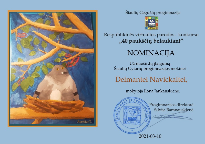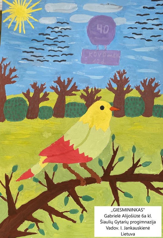 Konkurso tema - savęs atskleidimas, gimtojo krašto pažinimas per „Paukščio" simbolį, skirta parskrendančių paukščių dienai paminėti. Piešinių parodos-konkurso tikslas - plėtoti vaikų ir jaunimo kultūrinį bendravimą, puoselėti kūrybinius gebėjimus, skatinti mokinių kūrybiškumą ir saviraišką, bei meninės kūrybos sklaidą.Šiame konkurse dalyvavo 5-6 klasių mokiniai. Sėkmė nusišypsojo 5b klasės mokinei Deimantei Navickaitei ir 6a klasės mokinei Gabrielei Alijošiūtei. Sveikiname jaunąsias dailininkes.