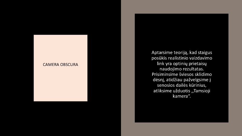 7a ir 7b klasės mokiniams į klausimą, o kur dar mes galėsime pritaikyti fizikos žinias, integruota fizikos ir dalės pamokų veikla bandė atsakyti Radvilų rūmų dailės muziejaus edukatorė Daiva Banikonienė. Susipažinę su tiesiaeigiu šviesos sklidimo dėsniu ir jį taikydami mokiniai analizavo „Camera obscura" veikimo principą ne tik juos supančioje aplinkoje, bet ir mene. Muziejaus edukatorė papasakojo apie menininkus savo kūryboje taikančius fizikos žinias, kartu su mokiniais tyrinėjo 16 a. meno kūrinius, fizikinius prietaisus. Mokiniai sužinojo dalykų praktinio panaudojimo galimybes, ugdė gebėjimą pritaikyti gamtos bei meno pasaulį aiškinančias žinias, plėtojo mokslinę pasaulėvoką bei estetinę nuovoką.Gamtos mokslų mokytoja Irma Bartkevičienė