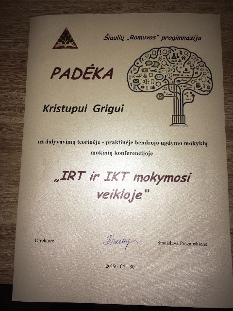 Balandžio 30 dieną 3a klasės mokinys Kristupas Grigas debiutavo mokinių teorinėje-praktinėje konferencijoje „IKT ir IRT mokymosi veikloje“ Šîaulių Romuvos progimnazijoje. Kristupas paruošė pranešimą „IT mano kasdienoje“. Pranešime papasakojo, ką jam reiškia kompiuteriai, kaip „atgaivino" savo funkcijų neatliekantį švedišką išmanųjį laikrodį ir papasakojo, kaip sugebėjo perkelti visus duomenis iš mamos seno telefono į naujai įsigytąjį. Kristupui plojo net aštuntokai!!!