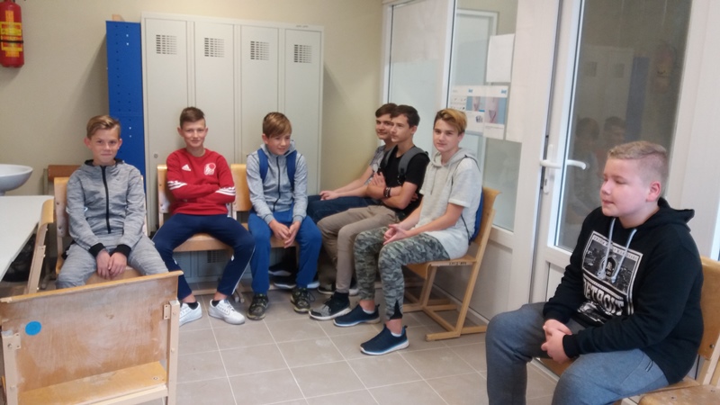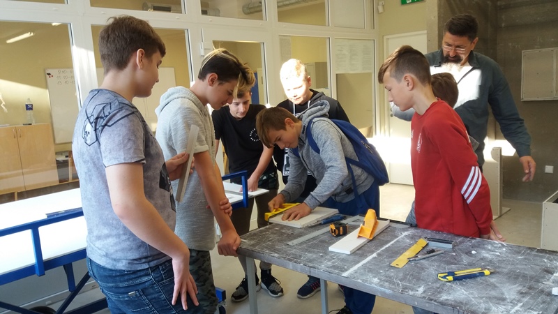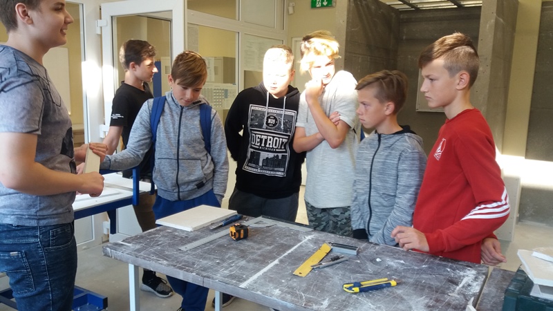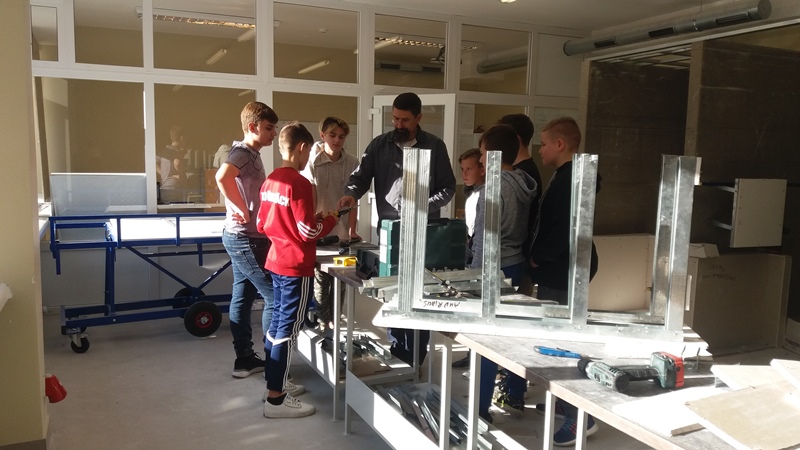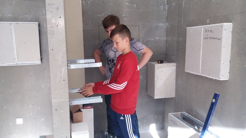 Po išsamaus dėstytojo pasakojimo apie medžiagas, tvirtinimo elementus jauniesiems meistreliams teko nemažai padirbėti, nes gavo praktinę užduotį – išpjauti ir prie sienos taisyklingai prisukti statybinę konstrukciją. Vyrukams buvo ką veikti!
