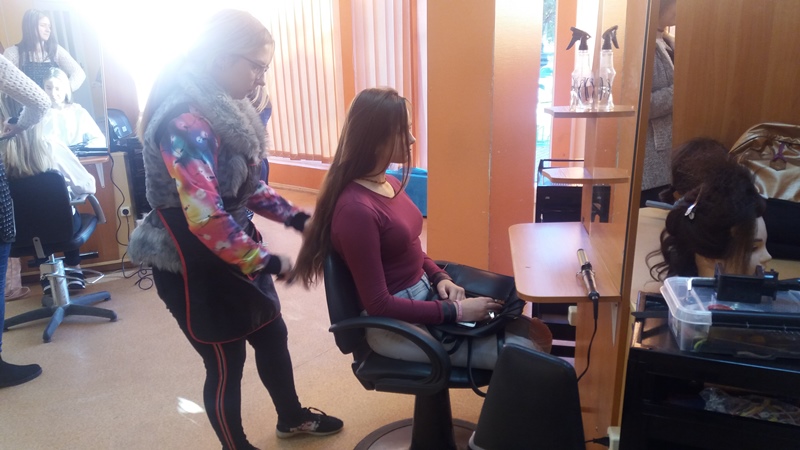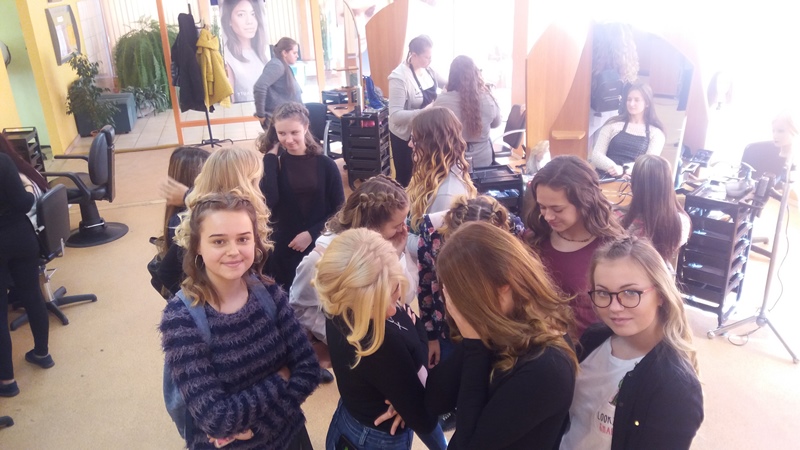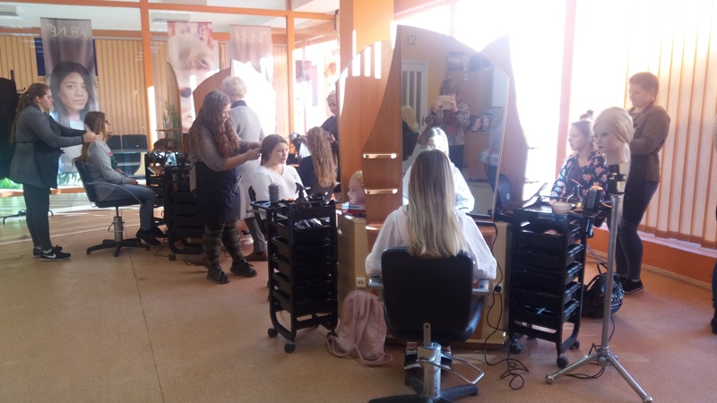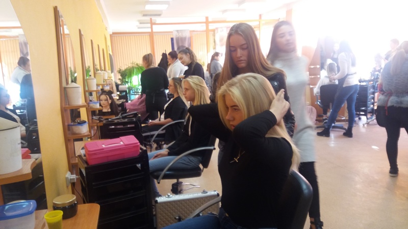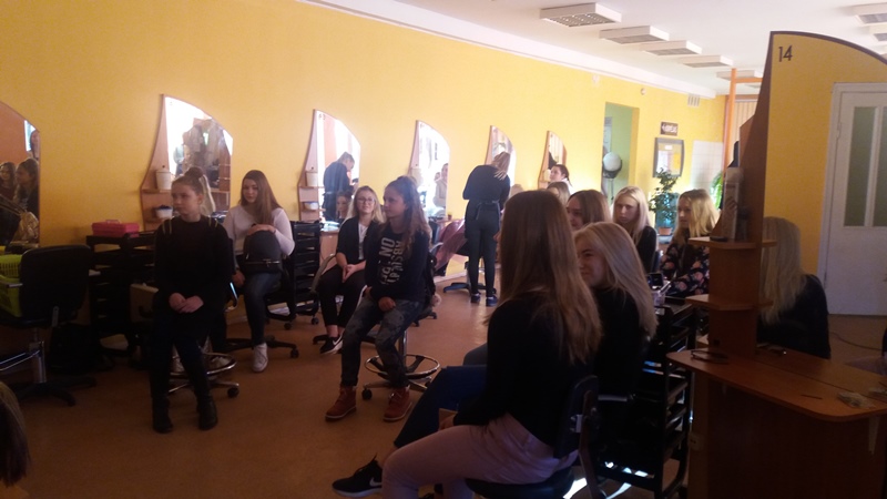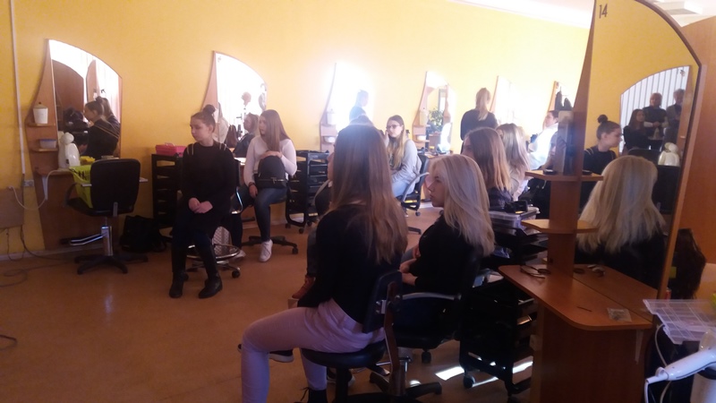 Gytariečių jau laukė nemažas būrys būsimų kirpėjų trečiakursių ir 2 mokytojos. Daug dalykėlių mūsų merginos sužinojo: ko ir kaip mokosi būsimos kirpėjos, ko išmoksta, kaip dirba; o kaip savo garbanas prižiūrėti, kas dabar madinga ir t.t. Kiekviena gytarietė gavo po asmeninę stilistę ir turėjo progos išbandyti, pasitikrinti, kas tinka, kas gražu.