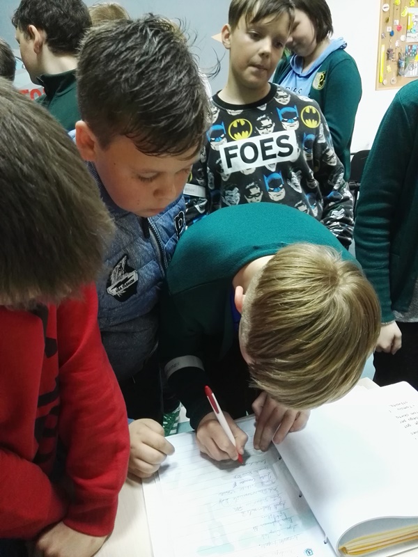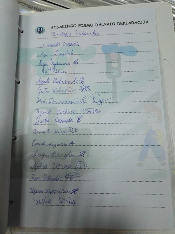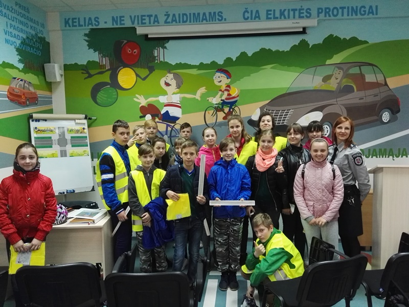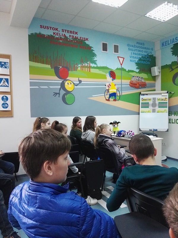 Balandžio 25 dieną penktokai kartu su mokytoja vyko į saugaus eismo klasę, kuri yra įrengta Šiaulių apskrities vyriausiajame policijos komisariate. Čia saugaus eismo įgūdžių galima įgyti saugioje ir būtent tam pritaikytoje aplinkoje. Mokiniai ne tik išklausė pareigūnės patarimų, kaip saugiai elgtis kelyje, bet ir patys galėjo juos išbandyti praktiškai – čia įrengtos mokomosios perėjos ir sankryžos, kuriose vaikai galėjo pritaikyti įgytas žinias. Išklausę policijos pareigūnės, išsiaiškinę kylančius neaiškumus dėl įvairių saugaus eismo klausimų, gavę ne tik gerų patarimų, bet ir dovanų, visi pasirašė Atsakingo eismo dalyvio deklaraciją.