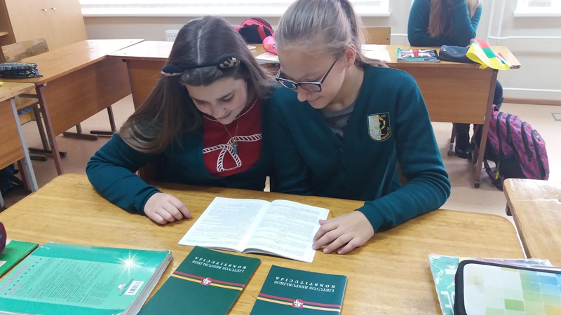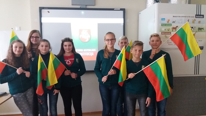 Mūsų mokyklos mokiniai taip pat paminėjo Konstitucijos dieną. Anglų kalbos mokytoja Asta Jogminienė, istorijos mokytoja Vilija Stočkienė mokiniams papasakojo apie Konstituciją, kartu su mokiniai aptarė piliečių teises ir pareigas, piešė piešnius, žiūrėjo filmus, klausėsi dainų.
