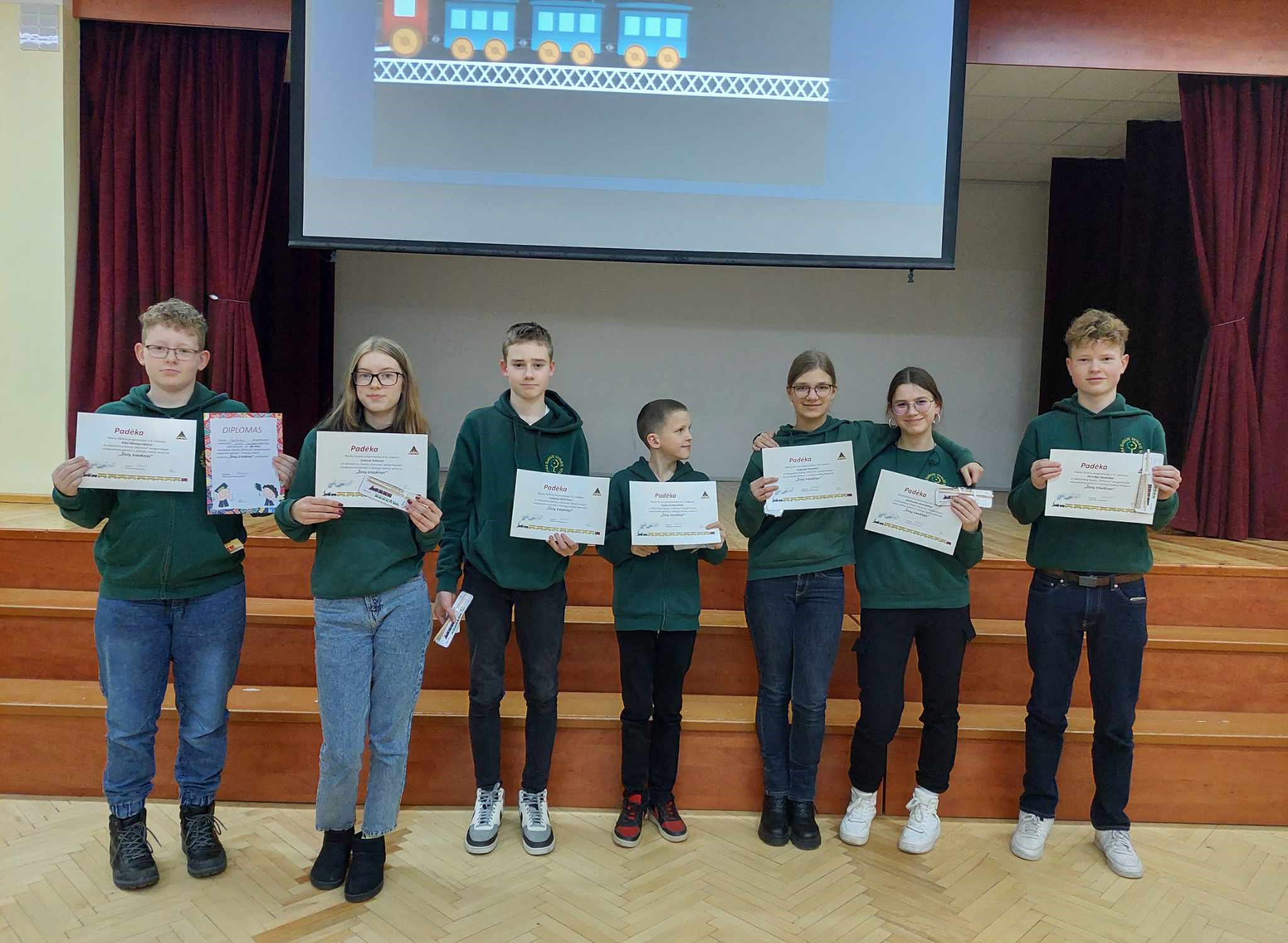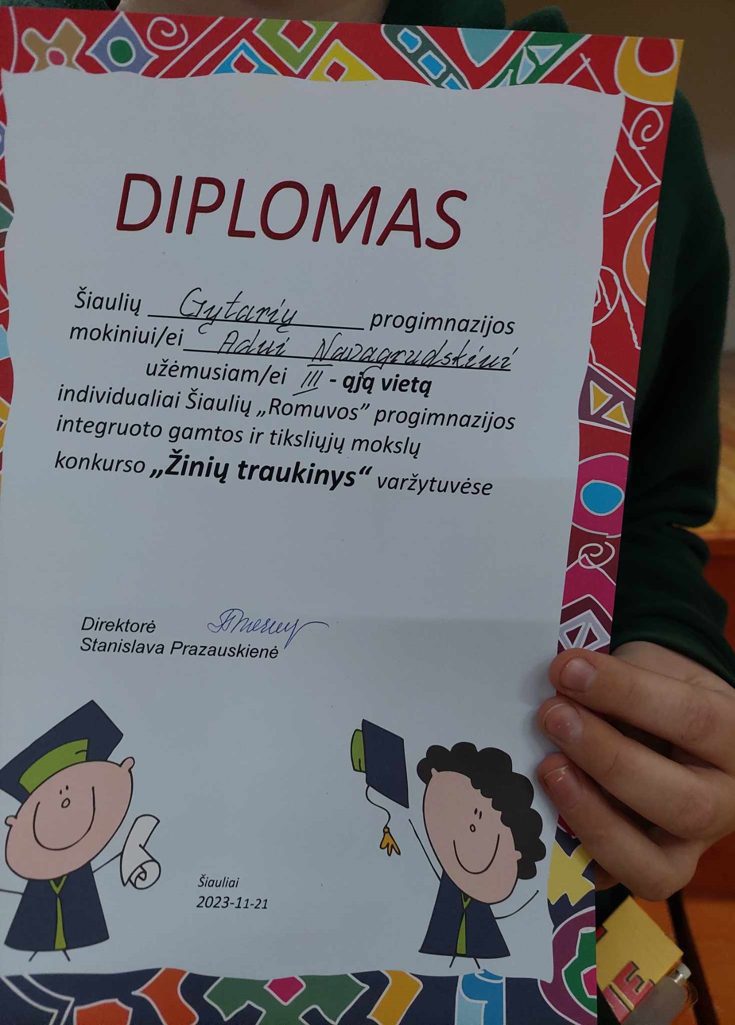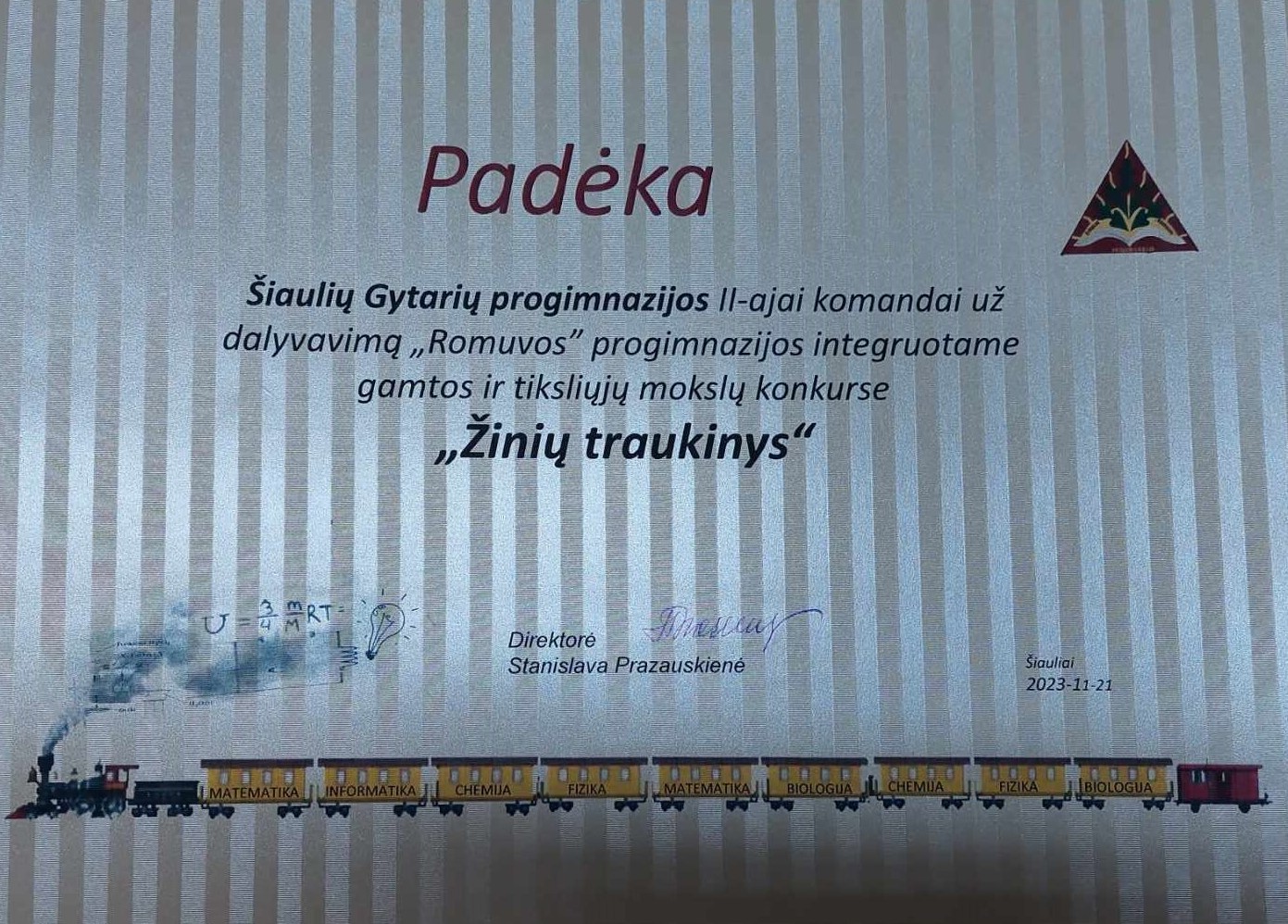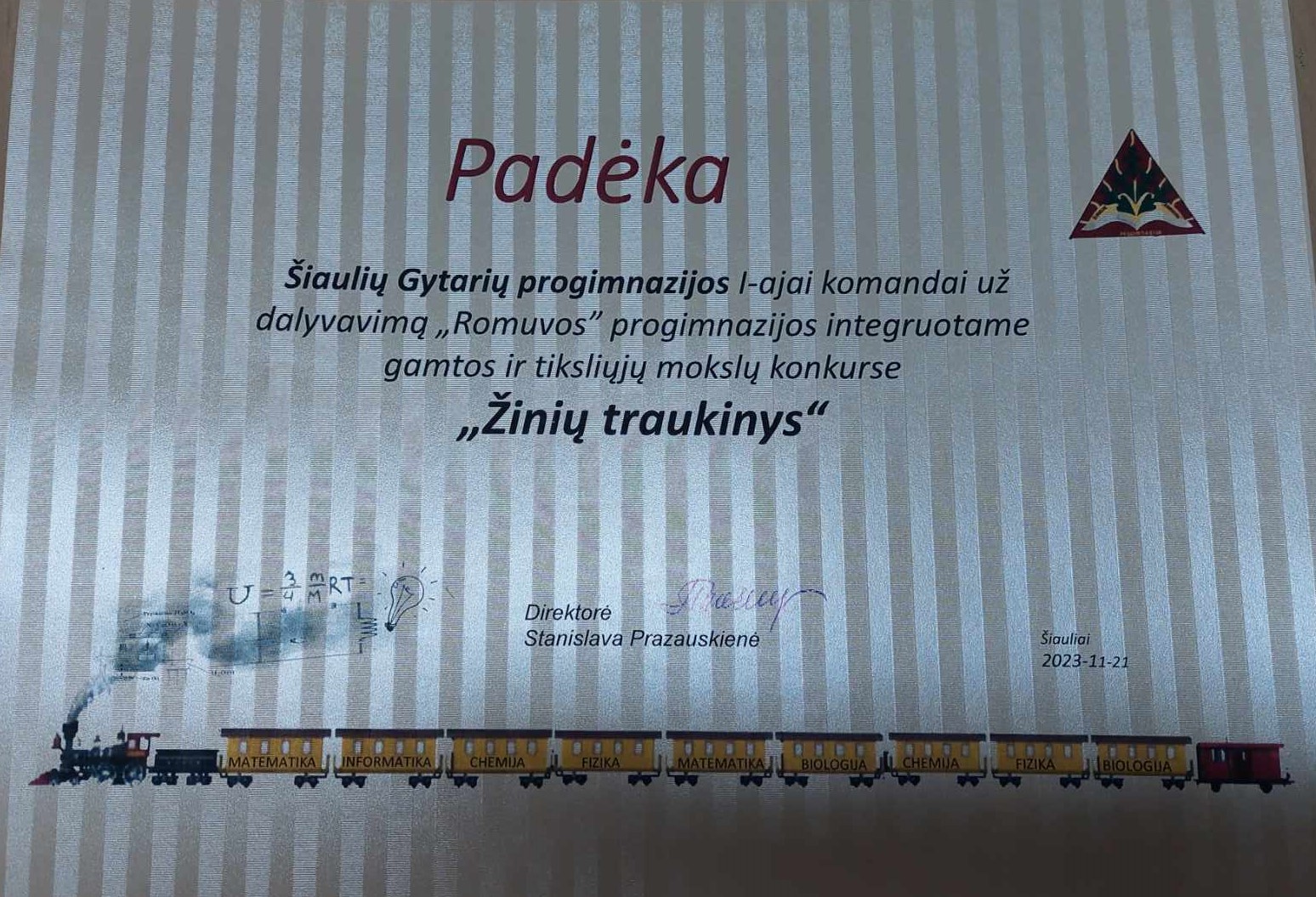 Lapkričio 21 d. dvi 5-8 kl. mokinių komandos (1 komanda: Liutauras Remeika 5a kl., Henrikas Remeika 6a kl., Augustė Stonytė 7a kl., Deimantė Navickaitė 8b kl.; 2 komanda: Emilija Dobrikaitė 5c kl., Adas Navagrudskis 6b kl., Imantas Bakčiūnas 7b kl., Sabina Ričkutė 8a kl.) dalyvavo į Šiaulių „Romuvos“ integruotame tiksliųjų ir gamtos mokslų konkurse „Žinių traukinys“. Komandos varžėsi su komandomis iš dešimties Šiaulių miesto progimnazijų. Gavę žemėlapius komandos išvyko į nurodytas šalis: fizikos, IT, matematikos, chemijos ir biologijos. Fizikos šalyje užsidėję apsauginius akinius ir pasinaudodami lazeriniais šviesos šaltiniais mokiniai turėjo tyrinėti šviesos spindulių eigą vandenyje ir stikle. Informatikos šalies stotelėje atliko programavimo ir skaičiuoklės užduotis. Atliekant užduotis reikėjo pasitelkti ne tik informatikos, bet matematikos žinias.