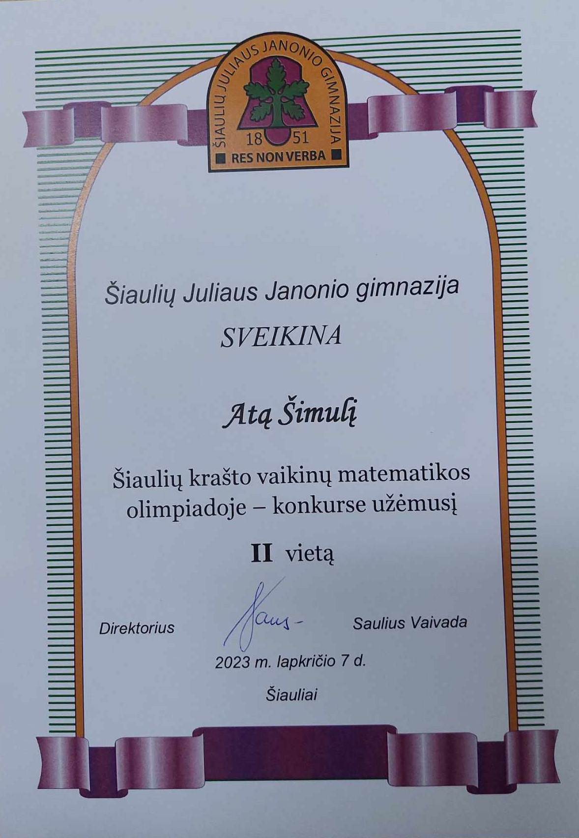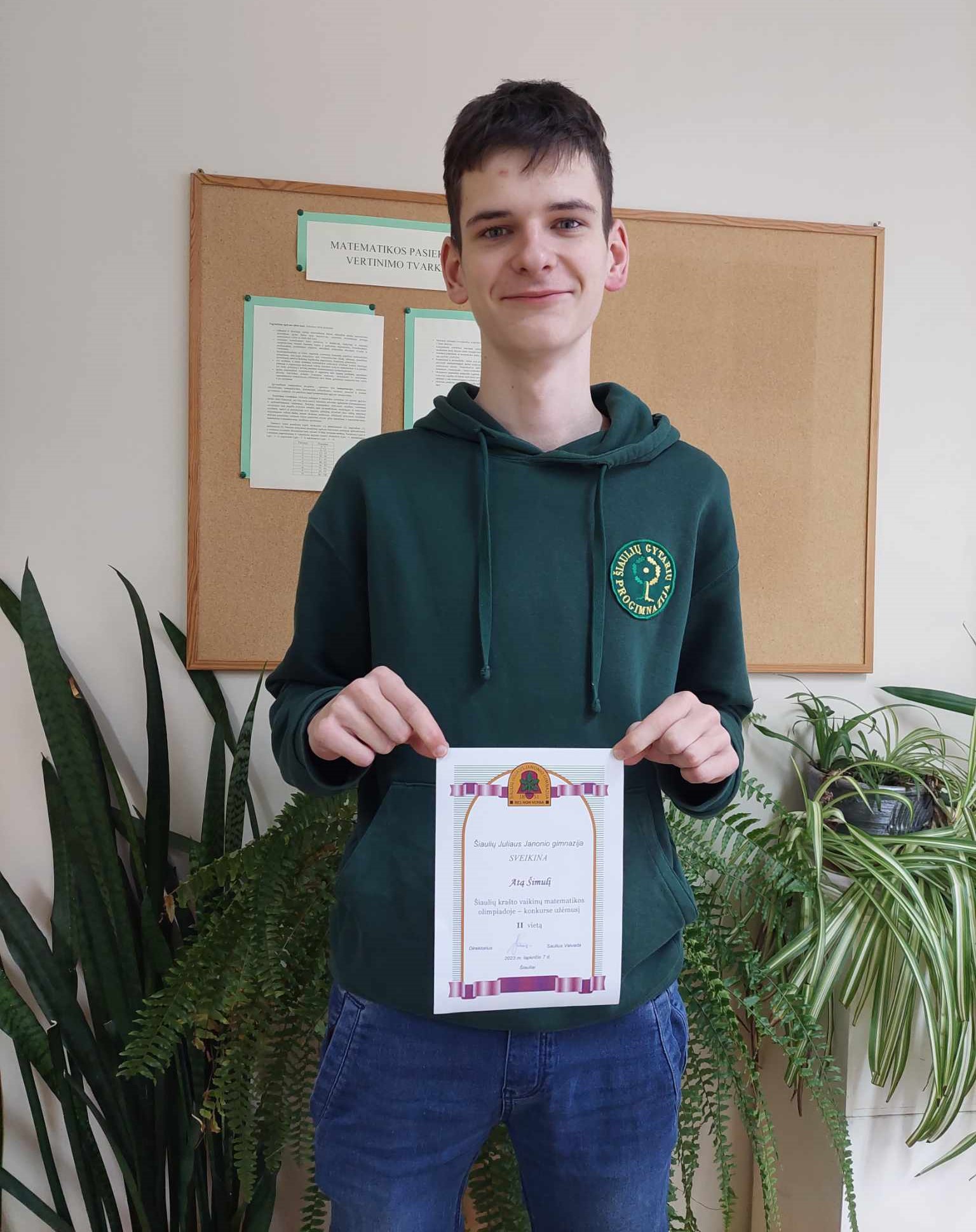 Spalio 26 dieną Šiaulių Juliaus Janonio gimnazijoje vyko Šiaulių krašto 8-12 kl. vaikinų matematikos olimpiada. Mūsų mokyklai olimpiadoje atstovavo 8b klasės mokiniai Atas Šimulis ir Augustas Varnas. Aštuntų klasių mokinių tarpe Atas Šimulis tapo II vietos nugalėtoju. Džiaugiamės Ato sėkme. Linkime sėkmės dalyvaujant kitose olimpiadose bei konkursuose.
