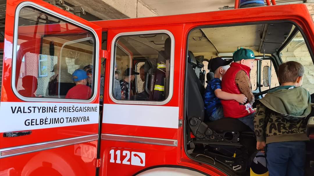 Ugniagesiai gelbėtojai pasitikę mažuosius ugdytinius, supažindino juos su gaisrinės patalpomis. Mokinukams pasitaikė puiki proga stebėti ugniagesių pratybas išsiliejus nežinomoms, bet įtariama pavojingoms medžiagoms. Po pratybų ugdytiniai smalsiai apžiūrėjo mašinas, kuriomis skubama gesinti gaisrų, susipažino su ugniagesių gelbėtojų darbu, specialia technika, įranga, skirta gaisrui gesinti. Didžiulį įspūdį vaikai patyrė įlipę į gaisrininkų mašiną, pasimatavę jų šalmus. Padėkoję už pažintinę pamoką, visi padarėme išvadą, kad ugniagesys turi būti drąsus, vikrus, visada pasiryžęs vykti į pagalbą. O kiekvienas iš mūsų turi elgtis atsakingai ir pilietiškai: nedeginti žolės, nepalikti vienos degančios žvakės, atsargiai elgtis su ugnimi.