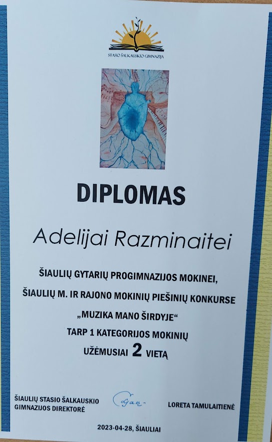 Mūsų progimnazijos mokinės Gabija Pankevičiūtė (8a), Simona Žvigaitytė (7c), Domantė Pokvytytė (8a), Adelija Razminaitė (8a), Demetra Kazlauskaitė (7c), Ermanta Vilimaitė (7b) dalyvavo Šiaulių Stasio Šalkauskio gimnazijoje vykusiame mokinių piešinių konkurse ,,Muzika mano širdyje“. Adelija laimėjo II vietą, o Ermanta gavo nominaciją ,,Už spalvinį muzikalumą“. Sveikiname mokines ir dailės mokytoją Iloną Jankauskienę.
