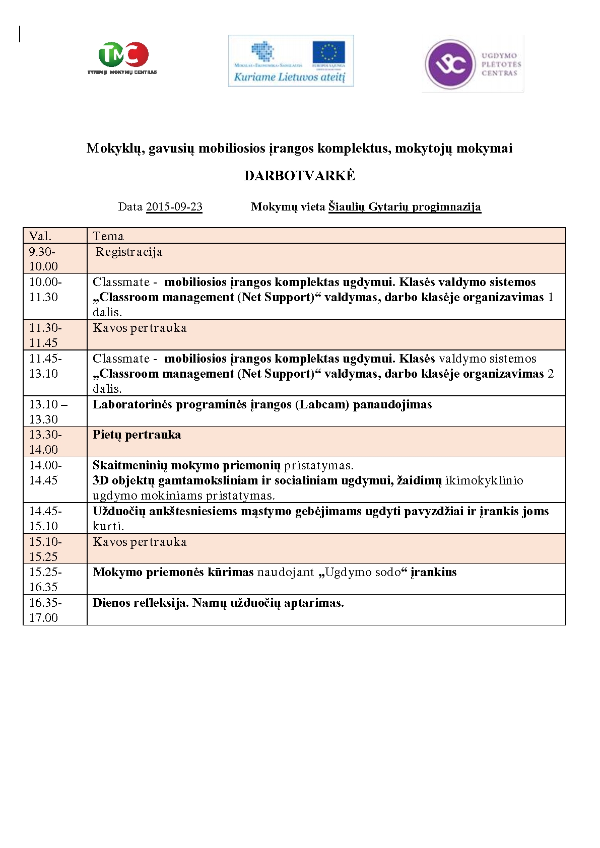 | 18September Mokyklų, gavusių mobiliosios įrangos komplektus, mokytojų mokymai |