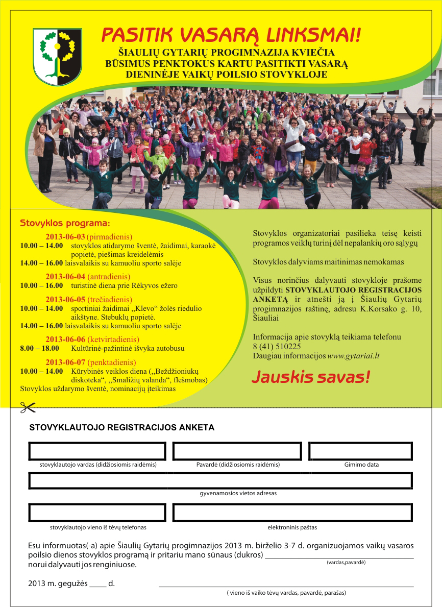 - stovyklautojo registracijos anketa, pasirašyta teisėto stovyklautojo (vaiko) atstovo (vieno iš tėvų / globėjų / rūpintojų).