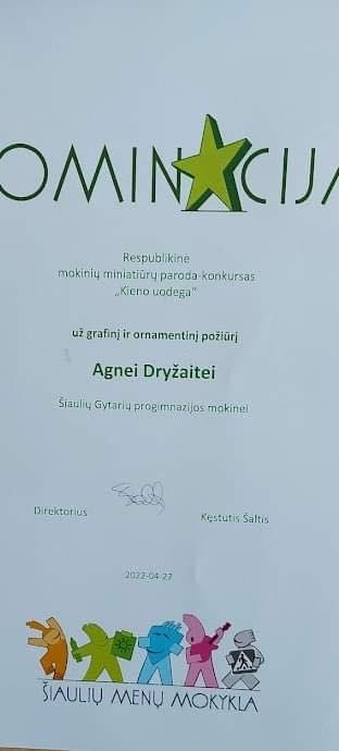 Visą balandžio mėnesį vyko Šiaulių menų mokyklos organizuotas konkursas ,,Kieno uodega”. Miniatiūros tai nedidelis pasaulis į kurį telpa labai daug. Viso dalyvavo 32 ugdymo įstaigos ir per 340 autorių. Tarp dalyvių ir mūsų mokylos mokiniai. Nominacija už grafinį ir ornamentinį požiūrį buvo įteikta 8a klasės mokinei Agnei Dryžaitei. Sveikiname! Dailės mokytoja I. Jankauskienė.