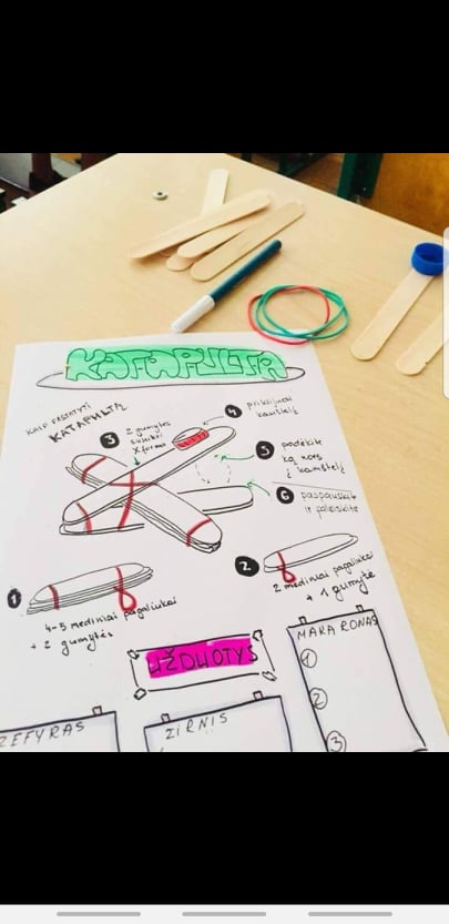 Netradicinės STEAM dienos metu priešmokyklinio ugdymo grupės mokiniai šiandien keliavo istorijos takais ir gamino katapultą. Savo sukonstruotomis priemonėmis mokiniai tyrinėjo kas toliau skrenda kaštonas, gilė, konkorėžis ar zefyras. Visi kartu aptarė kas lemia, kad daiktas skristų kuo toliau.Priešmokyklinio ugdymo grupės mokytoja Ingrida Tuomėnienė