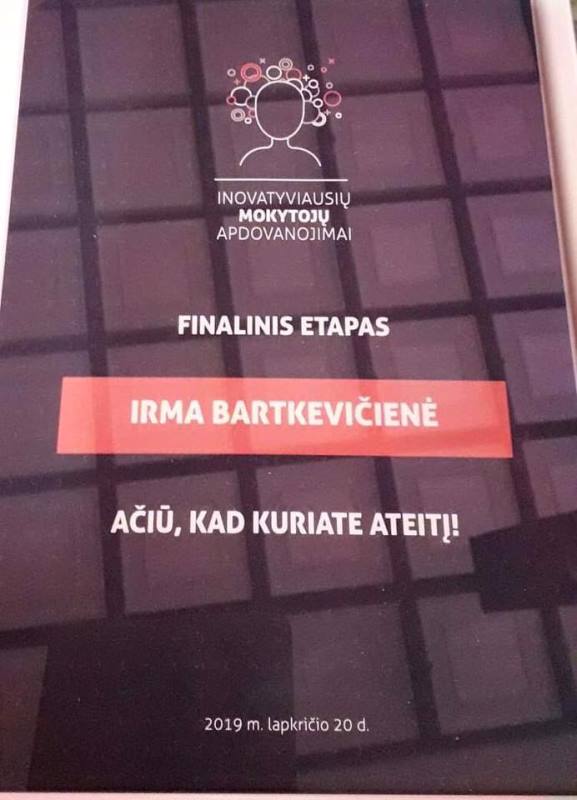 Džiaugiamės, kad į „Inovatyviausių mokytojų apdovanojimų" trejetuką pateko mūsų mokyklos gamtos mokslų mokytoja Irma Bartkevičienė (nominuota „Inovatyviausias fizikos mokytojas(-a)" nominacijoje) ir mokyklos direktorius Rimtautas Pečeliūnas (nominuotas „Metų mokyklos vadovas (-ė)" nominacijoje).
