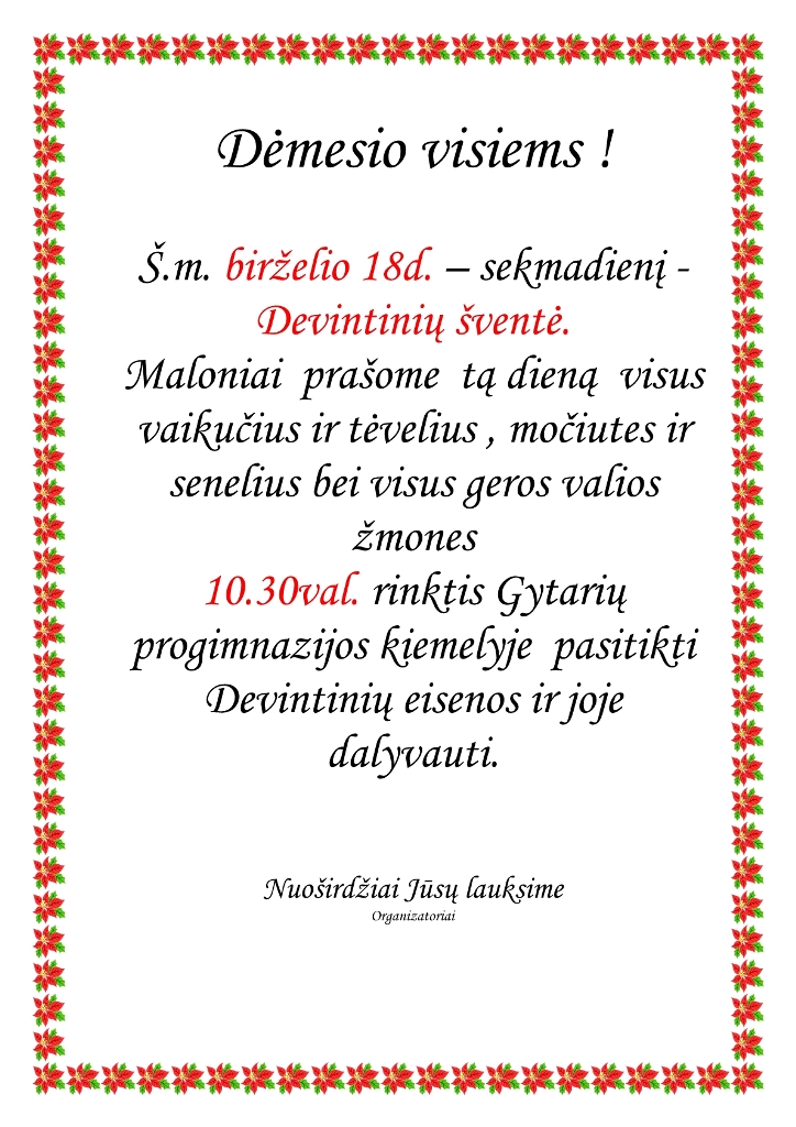 There are no translations available. Kviečiame būsimus pirmokus į „Vasaros mokyklėlę" birželio 6-8 dienomis. Užsiėmimai vyks nuo 9.00 iki 11.00 val. |